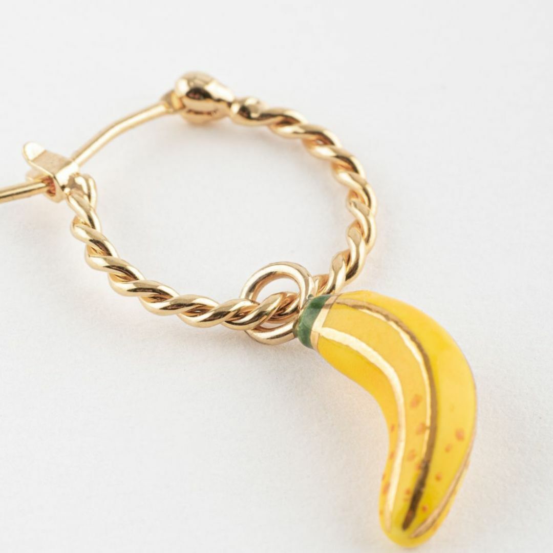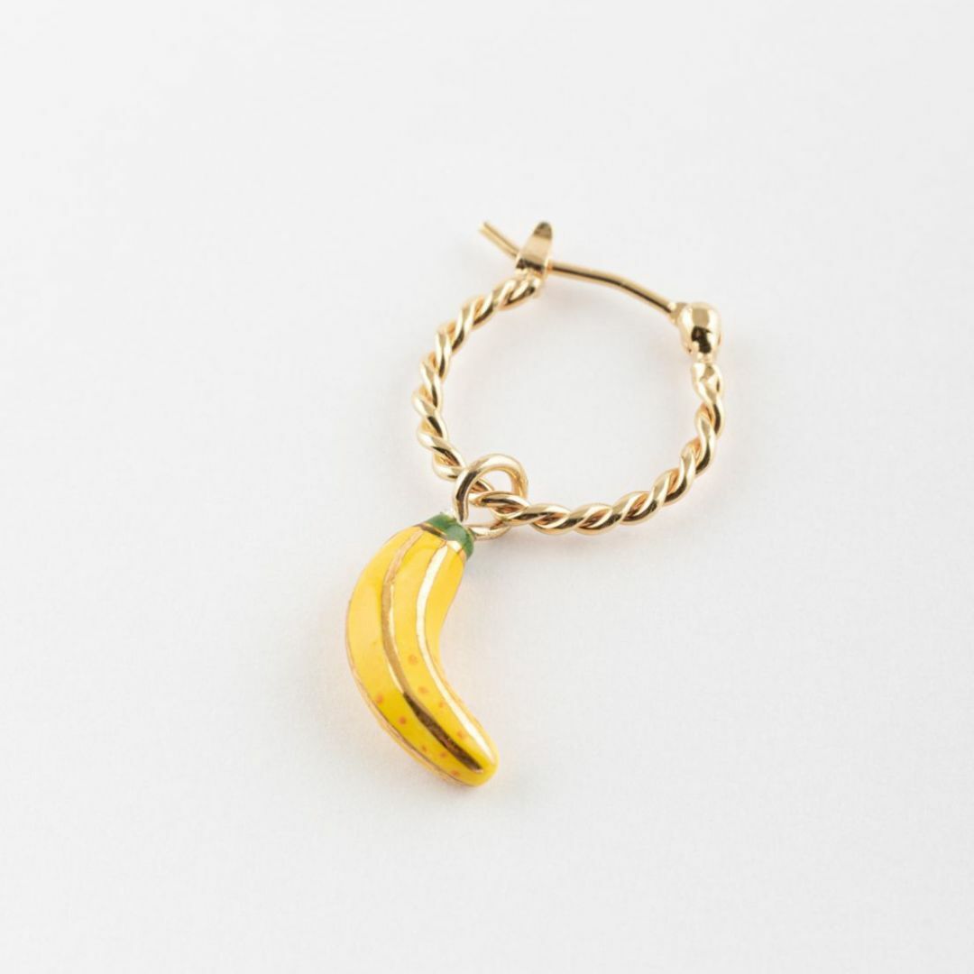 利用手繪的方式將香蕉勾勒出,看似簡單,但都能在細節看到用心,香蕉的斑紋細節都能看見,鮮豔的黃色讓人感到滿滿的正能量,是活潑可愛的你不得不擁有的耳環。