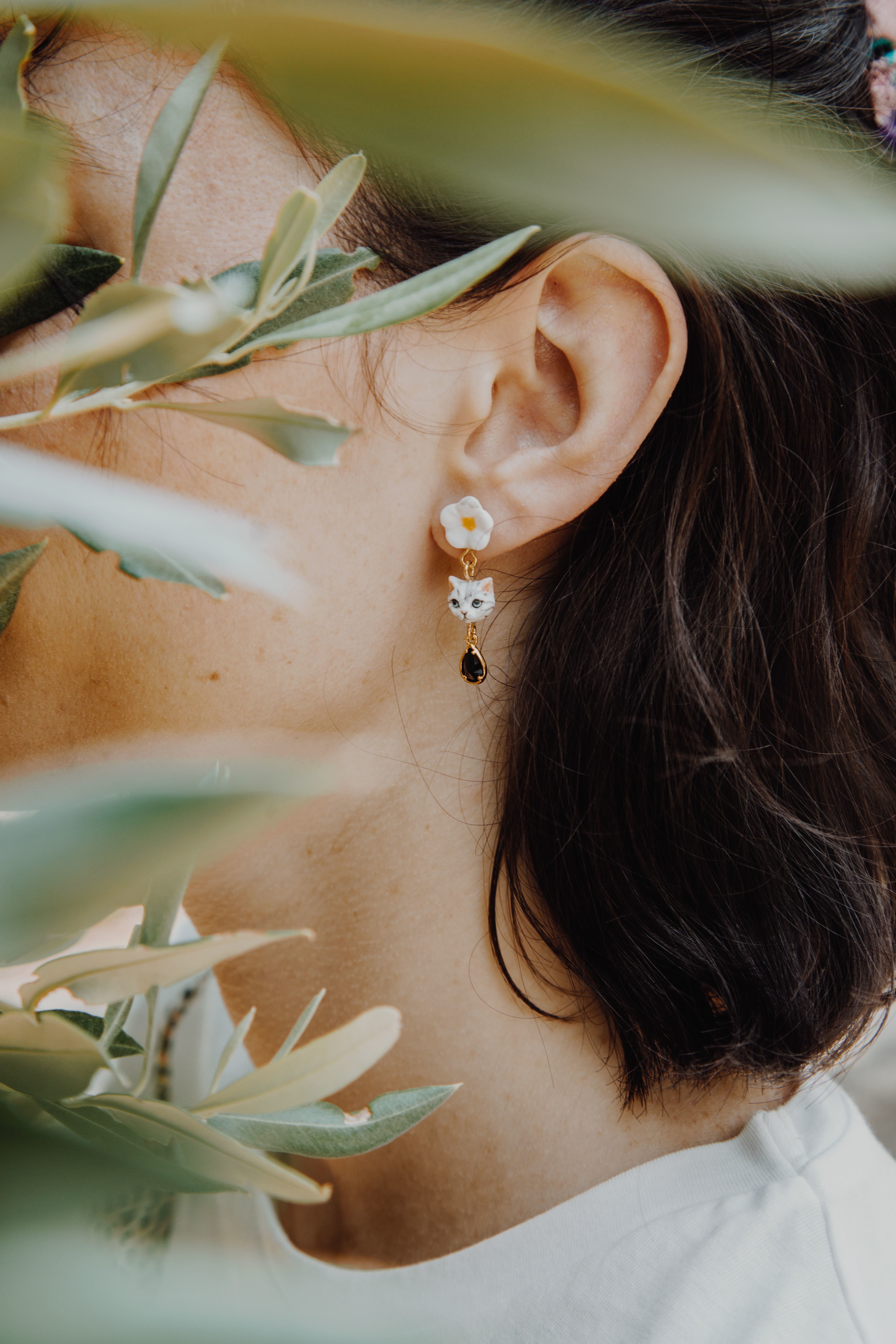 花、貓咪採用白瓷手繪製成,並由小花、貓咪、寶石往下排列垂墜式的造型設計,讓整體更擁有少女氣息,盡顯都會女性的優雅風格。