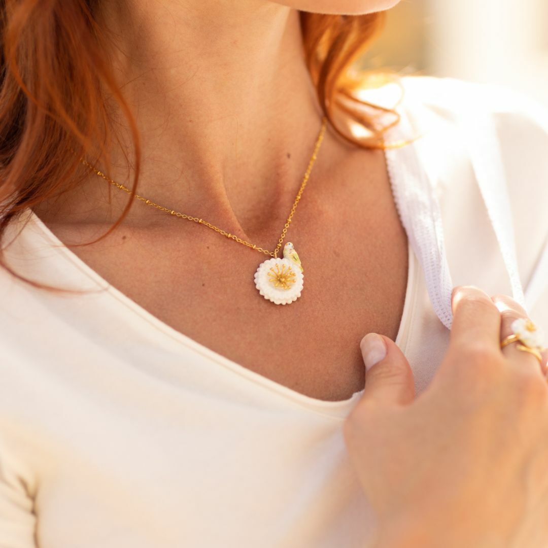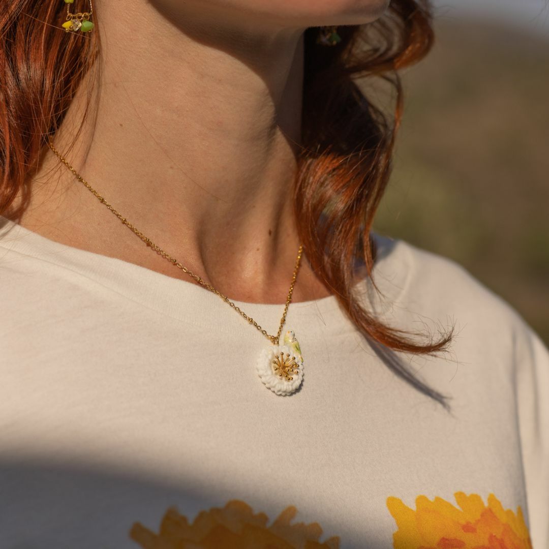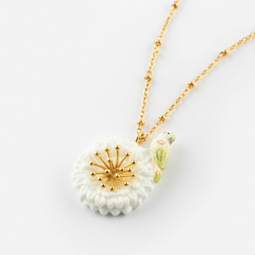 白色蒲公英與虎皮鸚鵡的相遇,鮮豔的羽毛與蒲公英白色花瓣交織,金色耀眼的花蕊讓人為之 一亮。